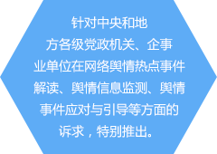 • 中新輿情是國(guó)內(nèi)從事數(shù)據(jù)研究服務(wù)的機(jī)構(gòu)之一,為中宣部輿情直報(bào)單位。我們長(zhǎng)期為中宣部、中聯(lián)部、中央網(wǎng)信辦、國(guó)新辦等政府部門(mén)及中國(guó)平安等眾多企事業(yè)單位提供輿情信息服務(wù)??蛻?hù)涵蓋了中央部委、地方政府、、安全、環(huán)保等多種類(lèi)型。